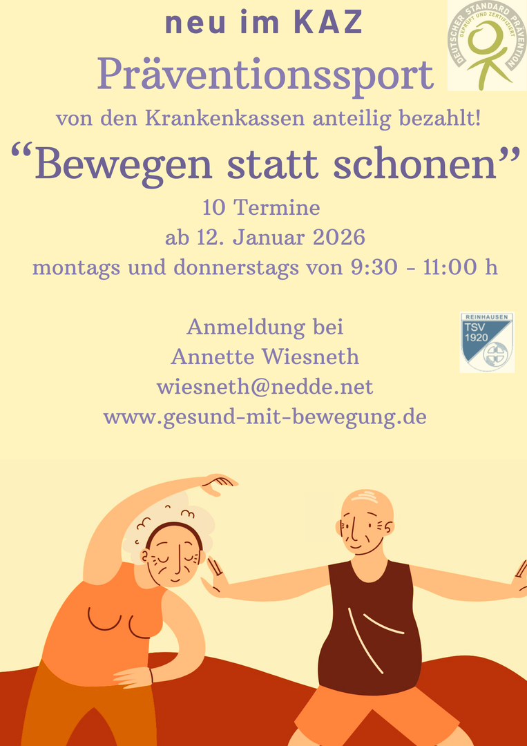Für die professionellen Bewegungsangebote von mir, Annette Wiesneth, wurde dem Verein TSV Reinhausen 1920 e.V. das Qualitätssiegel "Sport pro Gesundheit" verliehen. Dieses Qualitätssiegel wird vom DOSB (Deutscher Olympischer Sportbund) in Zusammenarbeit mit der Bundesärztekammer geprüft. "Pluspunkt Gesundheit".